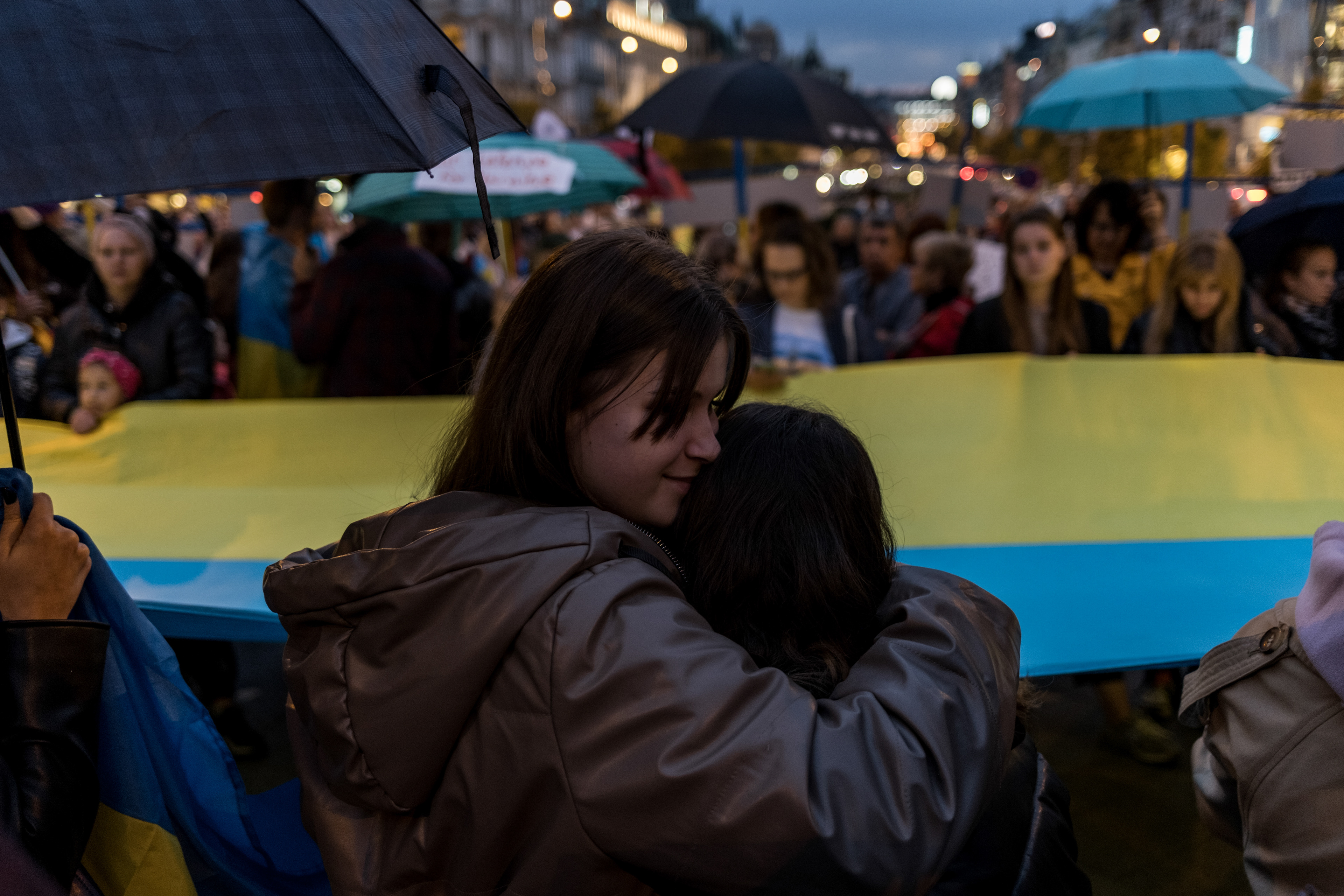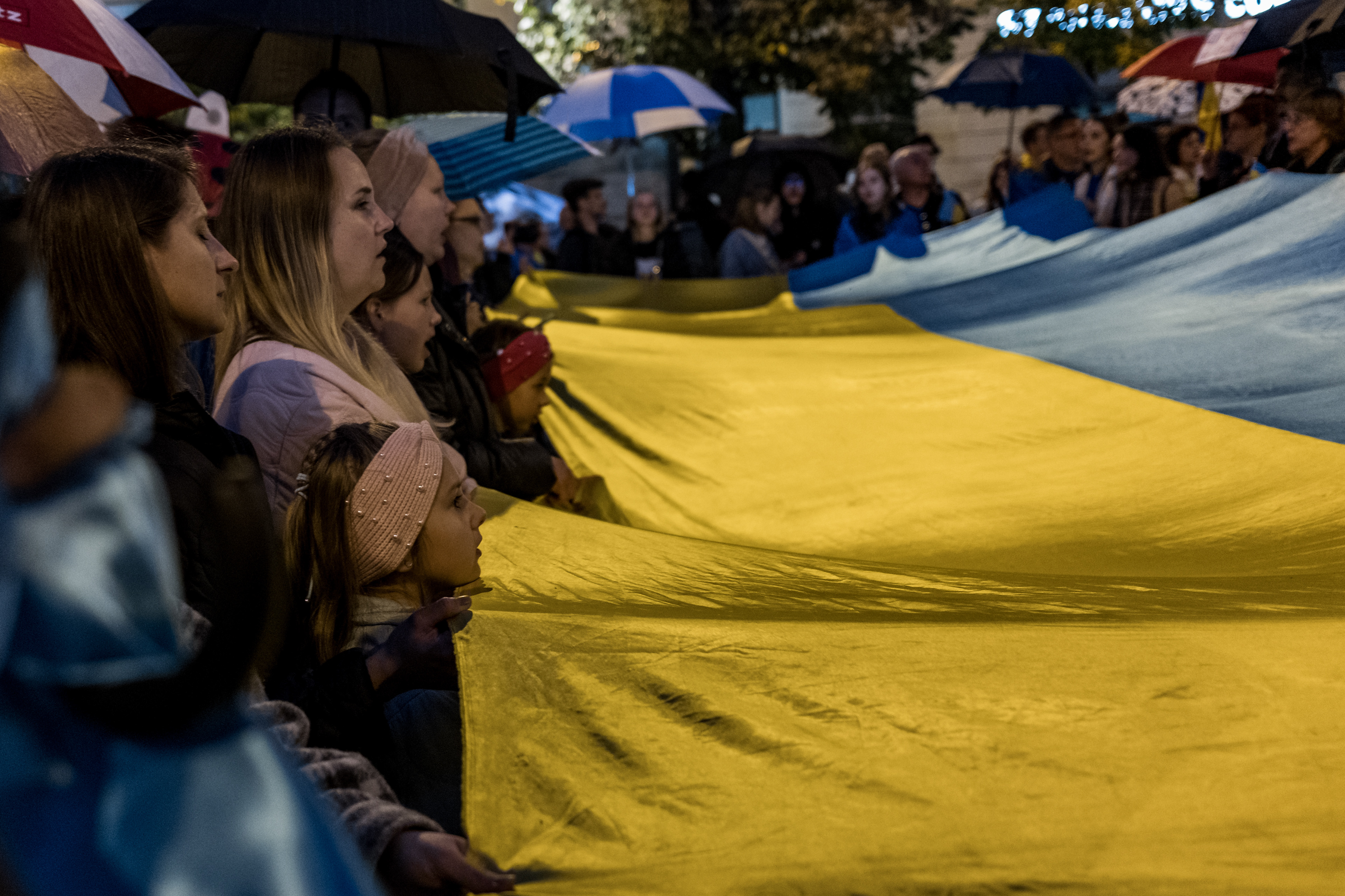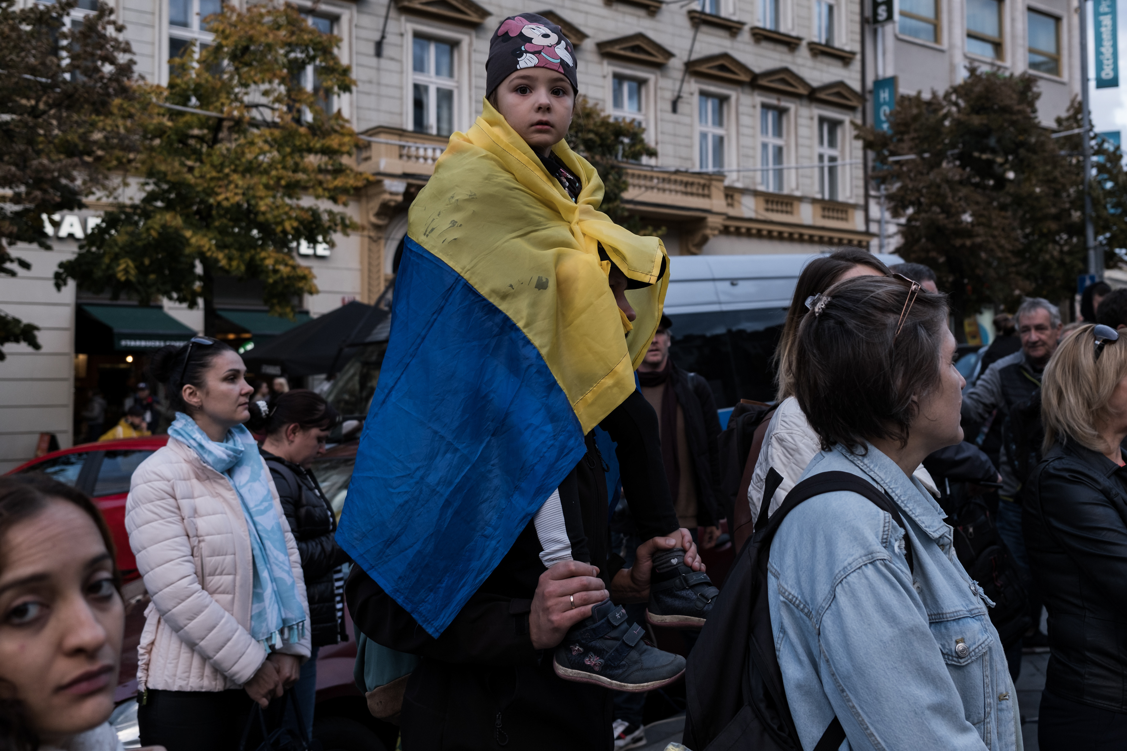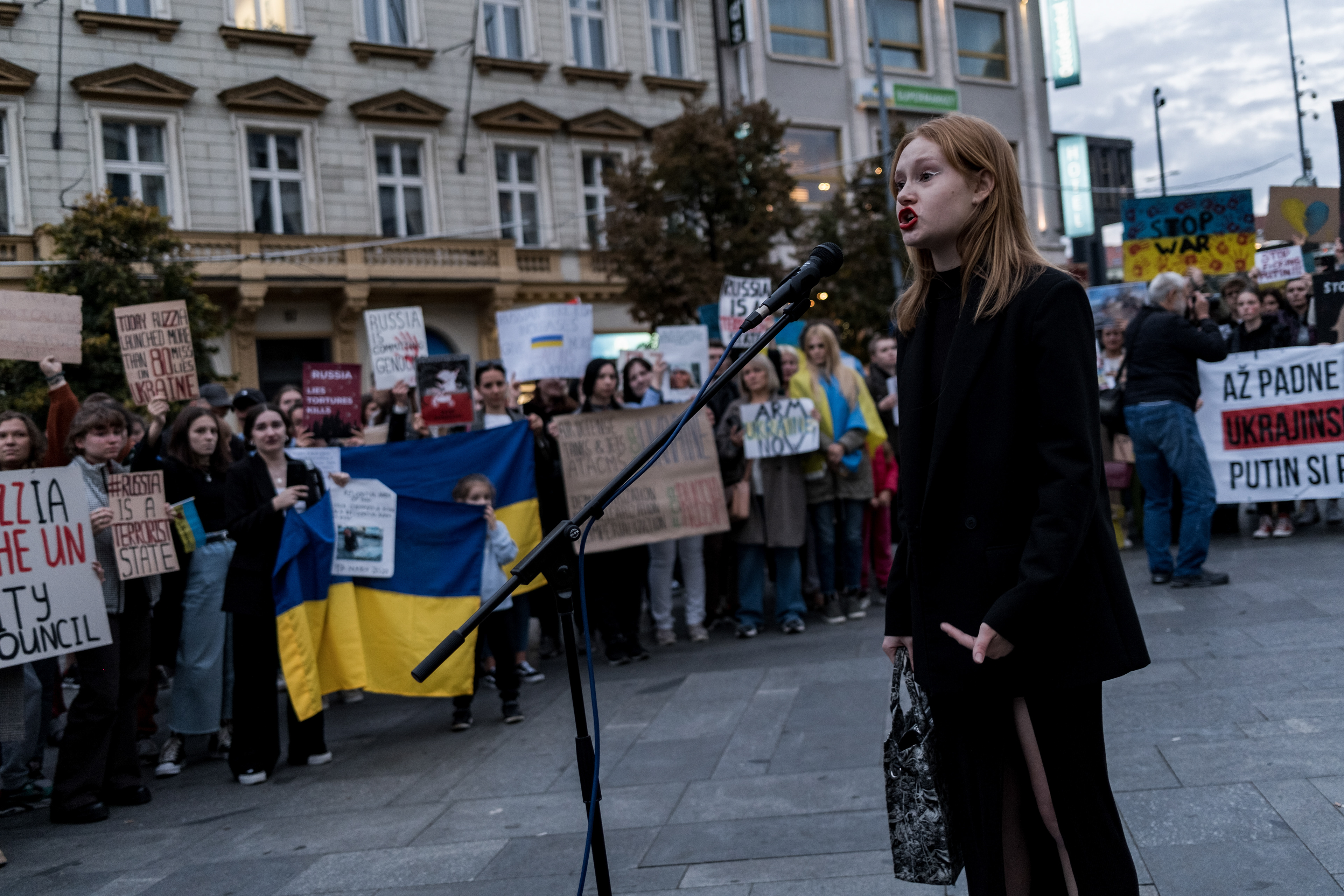 Stovky lidí se v pondělí 10. 10. 2022 sešlo odsoudit bombardování ukrajinských měst a demonstrovat proti válce, kterou na Ukrajině rozpoutalo Rusko.